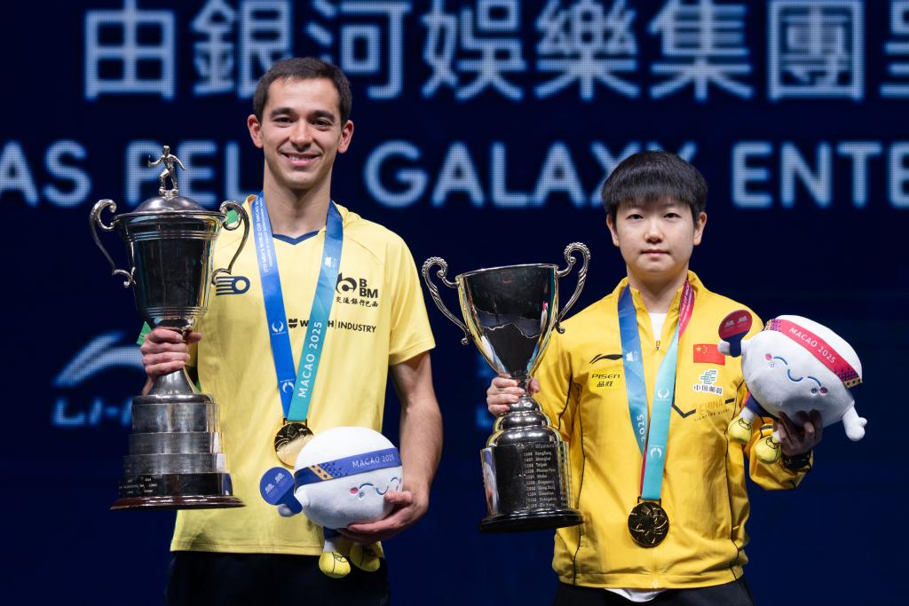 新華社澳門4月20日電(記者齊菲、孟佳)2025年國際乒聯(lián)男子及女子世界杯20日迎來收官戰(zhàn)。中國隊名將孫穎莎4:0戰(zhàn)勝隊友蒯曼,成功衛(wèi)冕冠軍。雨果·卡爾德拉諾則以4:1擊敗中國隊的林詩棟,成為首位獲得乒乓球世界杯男單冠軍的巴西運動員,而這也是中國男乒自2017年世界杯后,首次丟掉“三大賽”(奧運會、世乒賽、世界杯)單打冠軍。