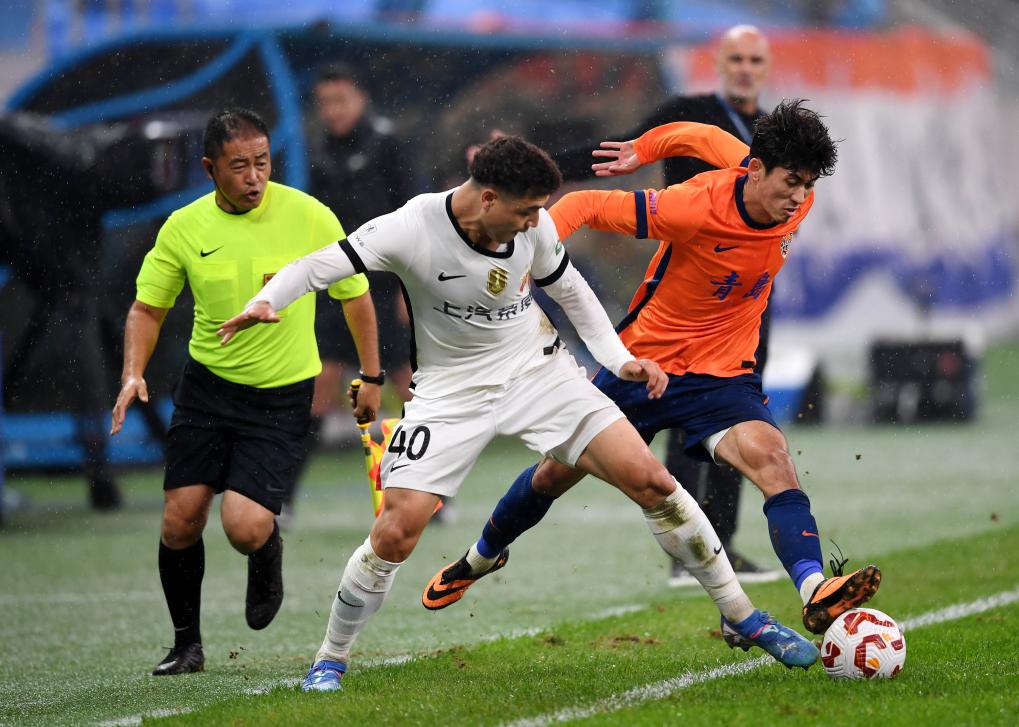 10月17日,上海海港隊球員吾米提江·玉蘇普(前左)在比賽中與青島海牛隊球員買烏郎·米吉提拼搶。當日,在山東青島舉行的2025賽季中超聯(lián)賽第27輪比賽中,上海海港隊客場4:3戰(zhàn)勝青島海牛隊。新華社記者 李紫恒 攝