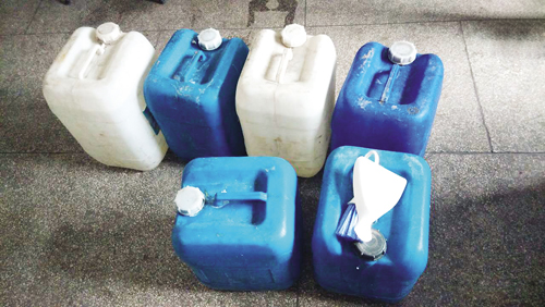 執(zhí)法人員在黑作坊取不合格洗潔精樣品
