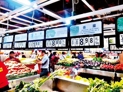 在超市水果專柜上,來自南方的許多熱帶水果價格偏高,本地和北方產(chǎn)的大眾水果價格適中。也有部分水果價格“喜人”,超市正在促銷的一種紅提葡萄品質(zhì)不錯,售價3.98元/斤,這個價格的紅提葡萄較往年同期便宜了整整一半,顧客爭相選購。圖為9月8日市民在家家利超市購買蔬菜。(魯明強 攝影報道)