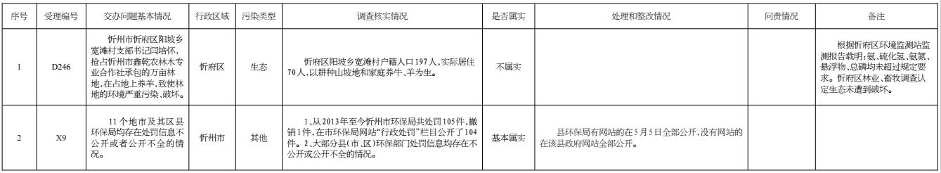 2017年5月2日晚,收到省群眾反映問題處置組督辦的第四批群眾反映問題共計2件。其中重點案件1件。我市高度重視,立即組織查處,截至5月5日,督辦的2件群眾反映問題已辦結(jié)。其中,確認基本屬實1件、不屬實1件。對于環(huán)保部門存在處罰信息不公開或者公開不全的情況,各縣(市、區(qū))已于2017年5月5日前全部在政府網(wǎng)站或環(huán)保部門網(wǎng)站進行了公開;對2件群眾反應(yīng)問題調(diào)查處理情況進行了信息公開。