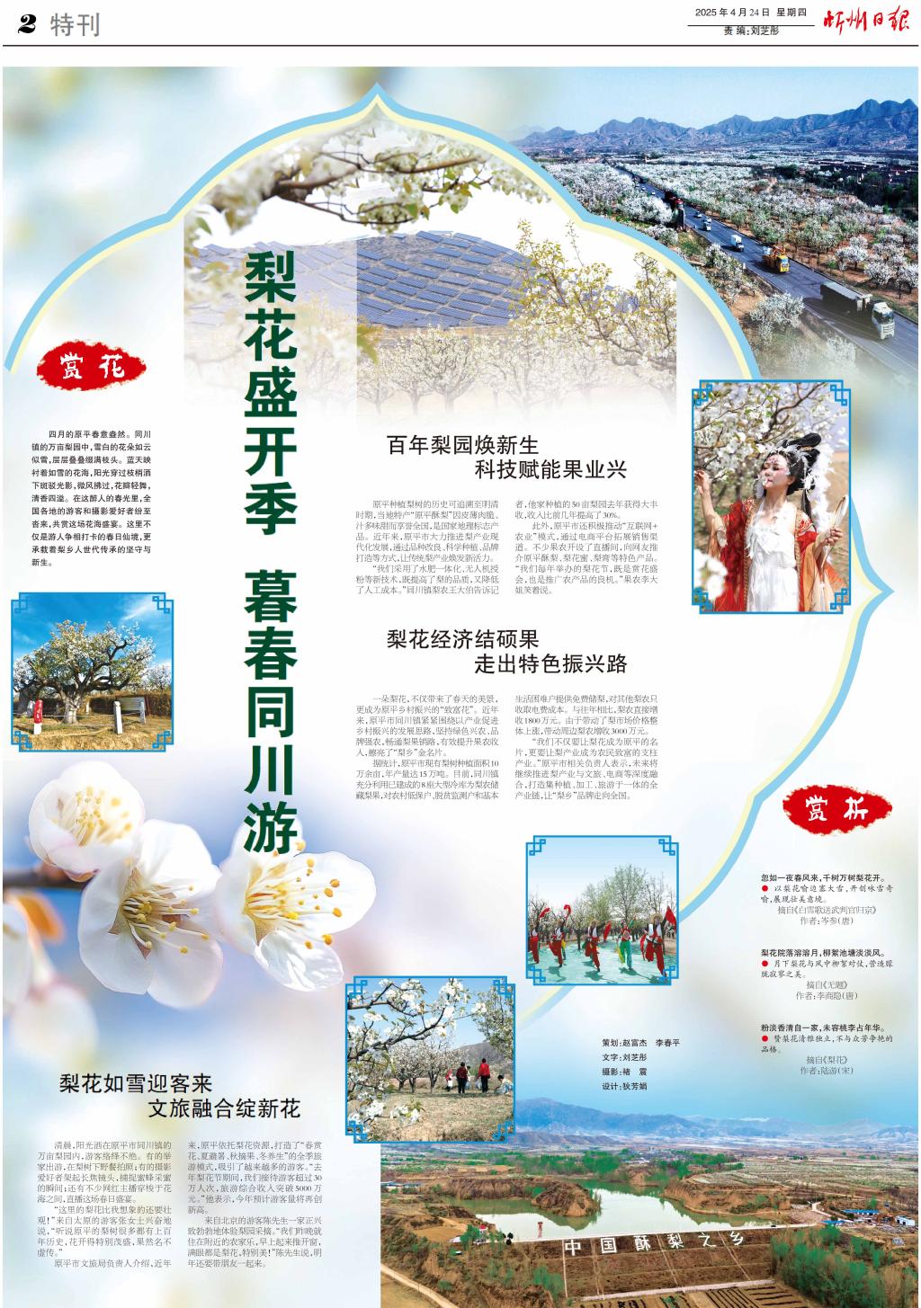 四月的原平春意盎然。同川鎮(zhèn)的萬畝梨園中,雪白的花朵如云似雪,層層疊疊綴滿枝頭。藍(lán)天映襯著如雪的花海,陽光穿過枝梢灑下斑駁光影,微風(fēng)拂過,花瓣輕舞,清香四溢。在這醉人的春光里,全國各地的游客和攝影愛好者紛至沓來,共賞這場花海盛宴。這里不僅是游人爭相打卡的春日仙境,更承載著梨鄉(xiāng)人世代傳承的堅守與新生。