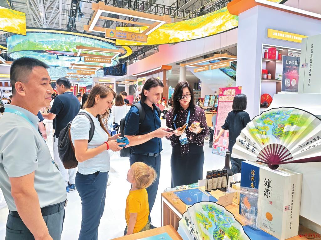 國外客商正在詳細了解代州黃酒品類。記者魏鵬飛 攝