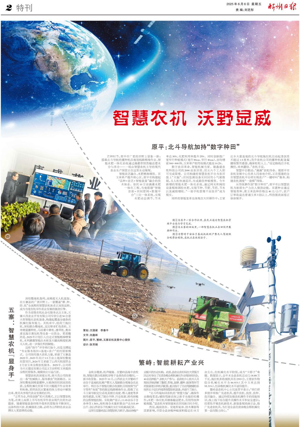 原平:北斗導航加持“數(shù)字種田” 芒種時節(jié),原平市廣袤的田野上景象一新:搭載北斗導航的播種機沿規(guī)劃線路精準作業(yè),智能水肥一體化系統(tǒng)通過滴灌帶悄然輸送著水分與養(yǎng)分……一場由智慧農(nóng)機主導的現(xiàn)代農(nóng)業(yè)生產(chǎn)圖景正在這里生動展現(xiàn)。 智能農(nóng)藝融合,水肥精準增效。在玉米單產(chǎn)提升核心區(qū),原平市構(gòu)建起“品種+農(nóng)藝+智能裝備”融合的技術(shù)體系。依托10萬畝滴灌水肥一體化工程,當?shù)卮罱ā爸悄苁撞?田間管網(wǎng)+數(shù)據(jù)平臺”三位一體系統(tǒng),實現(xiàn)水肥動態(tài)調(diào)節(jié),節(jié)水率達30%,化肥利用率提升25%。同時創(chuàng)新推廣寬窄行種植模式(寬行80cm、窄行40cm),畝均增密500-800株,玉米單產(chǎn)較傳統(tǒng)模式提高10.2%。 數(shù)字農(nóng)田革命,智能機械當家。隆鑫葳農(nóng)牧科技公司的2000畝農(nóng)田里,僅五六個工人即可完成管理。公司構(gòu)建的智慧農(nóng)機平臺為農(nóng)田裝上“大腦”:田間監(jiān)測設(shè)備實時回傳小氣候數(shù)據(jù),無人機快速巡田,生成最佳種植模型。今年新增的智能水肥一體化系統(tǒng),通過網(wǎng)關(guān)和閥控設(shè)備精準調(diào)控水肥,實現(xiàn)節(jié)種、節(jié)肥、節(jié)藥、節(jié)水以及減損增收?!耙徊渴謾C管理千畝良田”成為現(xiàn)實。 同樣的智能變革也體現(xiàn)在大田耕作中:王家莊鄉(xiāng)大蔥基地的北斗導航拖拉機自動起壟誤差不超過1.5厘米;茂升農(nóng)機公司的播種機配備漏播報警傳感器,確保粒粒入土。“設(shè)定路線后手機操控,效率翻倍?!鞭r(nóng)機手說。 智慧平臺聯(lián)動,“滴滴”農(nóng)機待命。據(jù)原平市農(nóng)機發(fā)展中心負責人閆春亮介紹,正在搭建的全市智慧農(nóng)機平臺將實現(xiàn)農(nóng)戶“一鍵呼叫”服務,構(gòu)建農(nóng)機調(diào)度“一盤棋”網(wǎng)絡(luò)。 從傳統(tǒng)耕作到“數(shù)字種田”,原平市以智慧農(nóng)機為新質(zhì)生產(chǎn)力注入強勁動能。雙惠種業(yè)通過智能育種,使玉米良種價格達40元/公斤,農(nóng)戶訂單收益達普通玉米3倍以上,科技強農(nóng)畫卷正徐徐展開。 五寨:智慧農(nóng)機“顯身手” 深松整地機轟鳴,高精度無人機盤旋,在五寨縣的廣袤田野上,一套覆蓋“耕、種、防、收”全流程的智慧農(nóng)機體系正高效運轉(zhuǎn),成為當?shù)赜袡C旱作農(nóng)業(yè)發(fā)展的強勁引擎。 作為省級有機社會化服務試點主體,五寨興茂農(nóng)業(yè)開發(fā)有限公司斥資引進50臺套大型智能化農(nóng)機裝備,構(gòu)建起覆蓋全鏈條的機械化服務能力。其機庫中,紐荷蘭拖拉機、深松聯(lián)合整地機、克拉斯青貯收獲機、玉米精量播種機、馬鈴薯中耕機、摟草機、奧庫麥克海爾裹包機等設(shè)備一應俱全。更前瞻的是,2025年計劃引入自走式智能精準噴霧機、水利灌溉智能出水樁及大疆高精度航測無人機,進一步強化科技賦能。 這些“鐵?!辈⒎菃未颡毝罚侵纹稹皩I(yè)服務組織+基地+農(nóng)戶”的托管新模式。公司依托強大農(nóng)機力量,承接了五寨縣2022年、2023年共計3.5萬畝土地深松整地托管項目,2024年又承接了山西天牧園草業(yè)2萬畝玉米全程農(nóng)機服務。2025年,公司將為興五建設(shè)發(fā)展公司近2萬畝籽粒玉米提供全程托管服務,規(guī)模效應日益凸顯。 智慧農(nóng)機的深度應用,使興茂公司探索出一條“機械換人、服務聯(lián)農(nóng)”的新路徑。從深松整地到精量播種,從植保防控到高效收獲,全程機械化托管不僅大幅提升作業(yè)效率和標準,更將農(nóng)民從繁重的體力勞動中解放出來,使其共享現(xiàn)代農(nóng)業(yè)發(fā)展的紅利。 “立草為業(yè),科技創(chuàng)新”的興茂模式,正以智慧農(nóng)機為筆,在黃土高原上書寫有機旱作農(nóng)業(yè)現(xiàn)代化的生動篇章。隨著智能裝備持續(xù)升級和托管服務不斷深化,這條科技興農(nóng)、機械強農(nóng)之路,必將為山西特色農(nóng)業(yè)品牌注入更澎湃的動能。 繁峙:智能耕耘產(chǎn)業(yè)興 金秋谷穗黃,機聲隆隆。在繁峙縣海豐農(nóng)牧場,智能化聯(lián)合收割機穿梭于金黃色的谷穗間,一派豐收景象。2023年10月,山西農(nóng)業(yè)大學繁峙千畝谷子基地機收測產(chǎn)暨無人駕駛聯(lián)合觀摩會在此舉行。兩臺谷子智能化聯(lián)合收割機分別按照“回”字型和“魚尾”型的既定線路精準作業(yè),搭載了北斗衛(wèi)星導航定位系統(tǒng)及割臺高度、喂入速度等多組傳感器,實現(xiàn)了割臺升降、行走收割、轉(zhuǎn)彎卸糧的全程智能控制。實收測產(chǎn)顯示,11.05畝谷子含雜率僅1.56%,按標準含水量折算畝產(chǎn)達515.49公斤,創(chuàng)山西省谷子機械化實打?qū)嵤兆罡呒o錄。 這背后是繁峙縣以智慧農(nóng)機為抓手,推動雜糧產(chǎn)業(yè)振興的生動實踐。此前,縣農(nóng)業(yè)農(nóng)村局在大營鎮(zhèn)萬民莊村舉辦了優(yōu)質(zhì)雜糧全程機械化作業(yè)現(xiàn)場培訓會,40余名種植戶、農(nóng)機大戶參與。縣農(nóng)機中心技術(shù)人員現(xiàn)場詳細講解了撒肥、犁地、旋耕、播種、植保等環(huán)節(jié)的裝備要點和機具配置,重點推介了自動駕駛輔助系統(tǒng)和北斗定位終端等智慧農(nóng)機裝備,并進行了演示。
