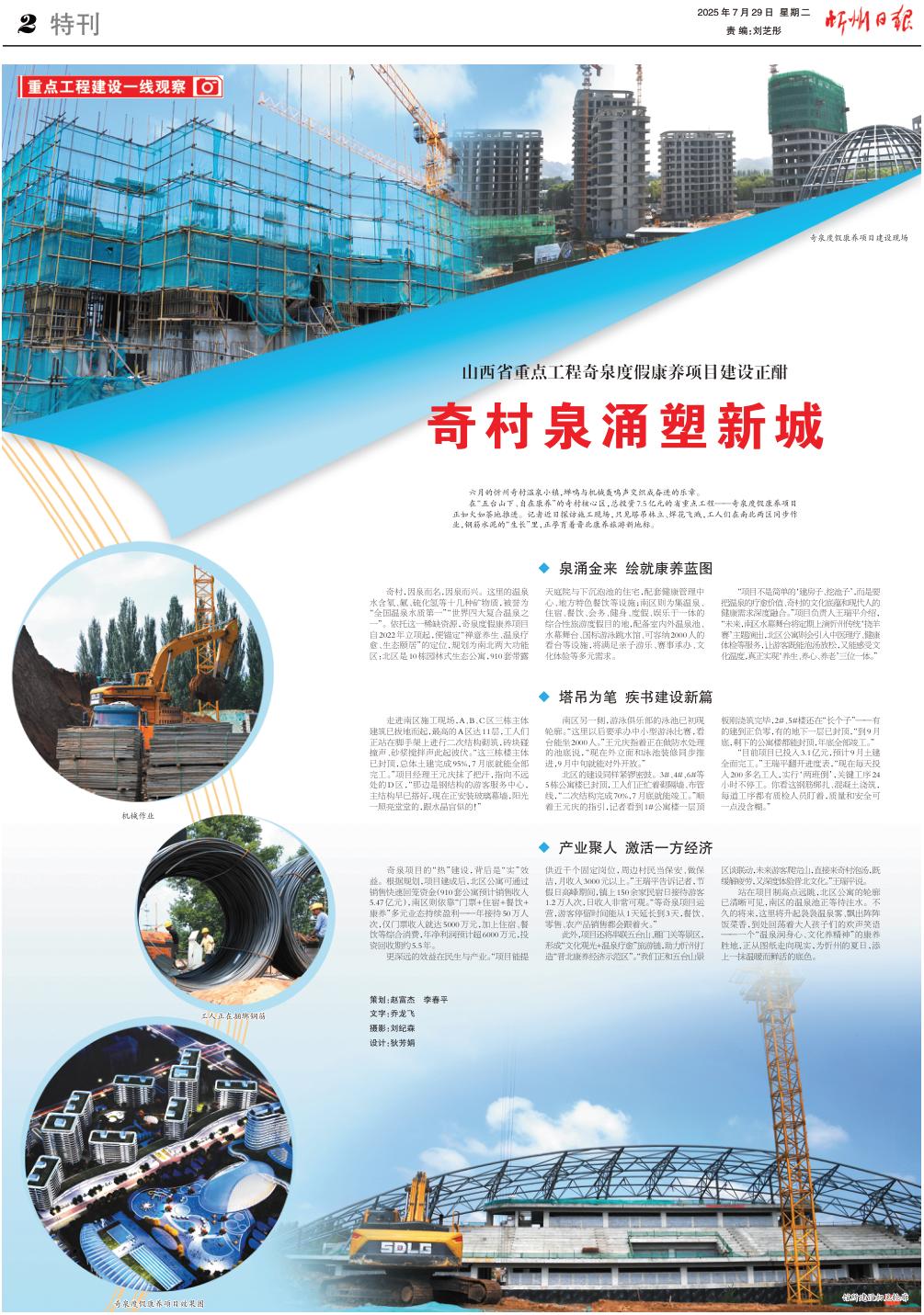 在“五臺(tái)山下、自在康養(yǎng)”的奇村核心區(qū),總投資7.5億元的省重點(diǎn)工程——奇泉度假康養(yǎng)項(xiàng)目正如火如荼地推進(jìn)。記者近日探訪施工現(xiàn)場(chǎng),只見塔吊林立、焊花飛濺,工人們?cè)谀媳眱蓞^(qū)同步作業(yè),鋼筋水泥的“生長”里,正孕育著晉北康養(yǎng)旅游新地標(biāo)。