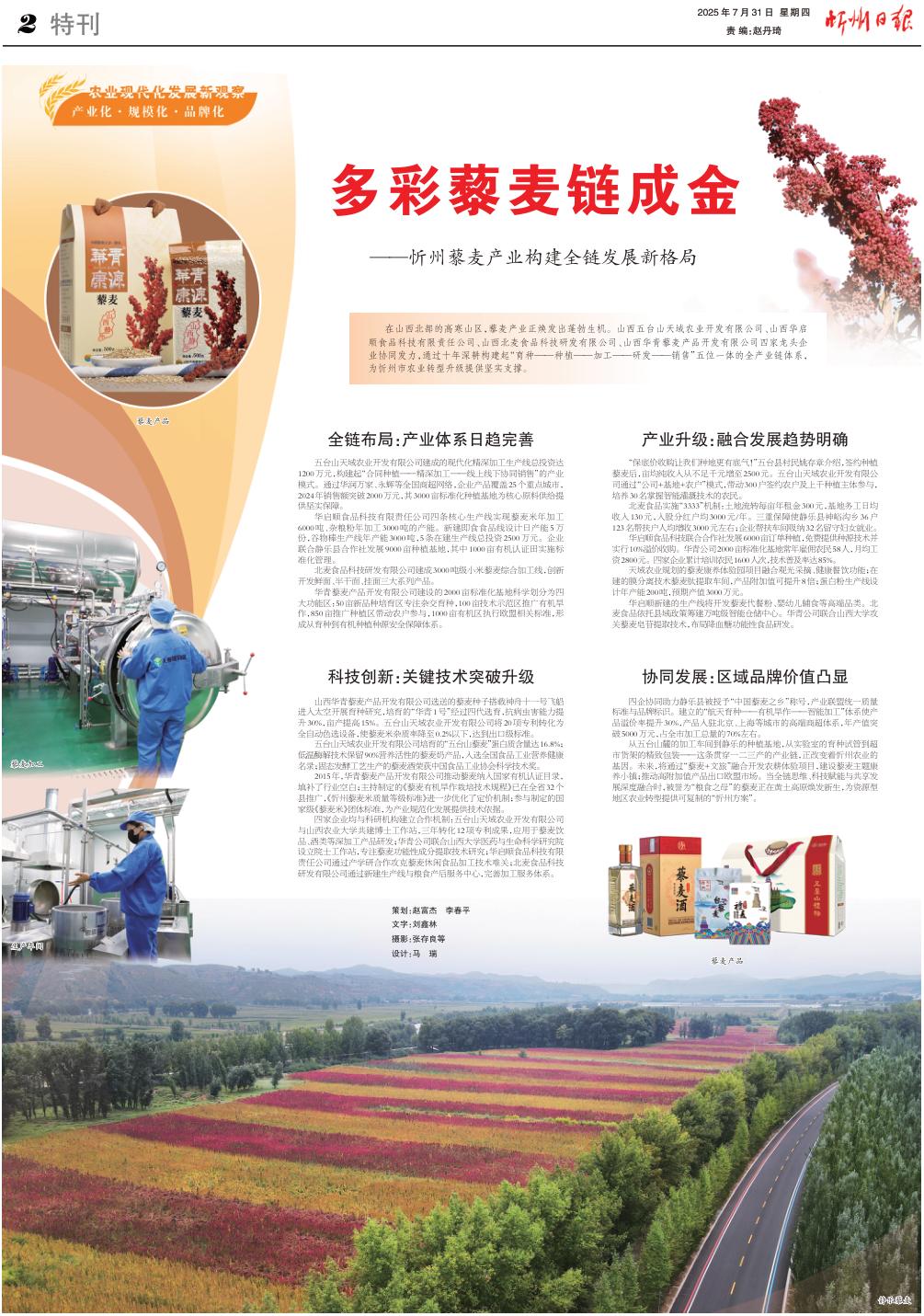 從五臺(tái)山麓的加工車間到靜樂的種植基地,從實(shí)驗(yàn)室的育種試管到超市貨架的精致包裝——這條貫穿一二三產(chǎn)的產(chǎn)業(yè)鏈,正改變著忻州農(nóng)業(yè)的基因。未來,將通過“藜麥+文旅”融合開發(fā)農(nóng)耕體驗(yàn)項(xiàng)目,建設(shè)藜麥主題康養(yǎng)小鎮(zhèn);推動(dòng)高附加值產(chǎn)品出口歐盟市場。當(dāng)全鏈思維、科技賦能與共享發(fā)展深度融合時(shí),被譽(yù)為“糧食之母”的藜麥正在黃土高原煥發(fā)新生,為資源型地區(qū)農(nóng)業(yè)轉(zhuǎn)型提供可復(fù)制的“忻州方案”。