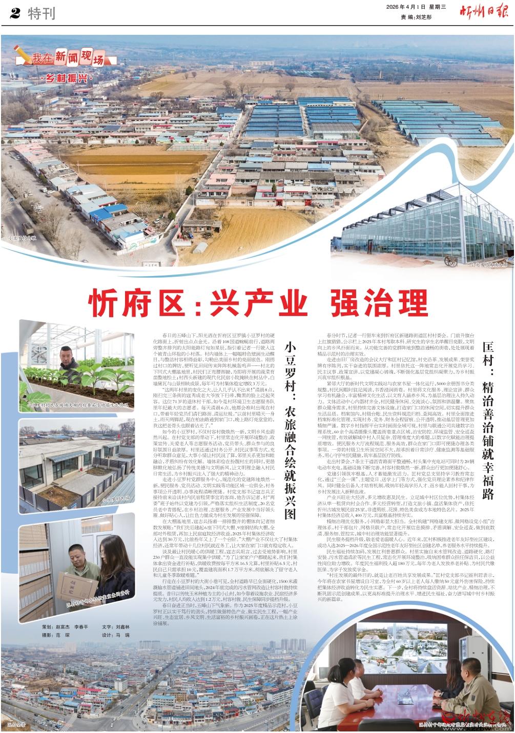 春日的五峰山下,陽(yáng)光灑在忻府區(qū)豆羅鎮(zhèn)小豆羅村的硬化路面上,折射出點(diǎn)點(diǎn)金光。沿著108國(guó)道蜿蜒前行,道路兩旁整齊排列的太陽(yáng)能路燈宛如星辰,指引著記者一行駛?cè)脒@個(gè)被青山環(huán)抱的小村落。村內(nèi)墻體上一幅幅特色壁畫生動(dòng)醒目,與整潔村容相得益彰,勾勒出美麗鄉(xiāng)村的亮麗底色。剛拐過村口的牌坊,便聽見田間傳來陣陣機(jī)械轟鳴聲——村北的下凹式大棚基地里,村民們正彎腰揮鋤,為即將開展的蔬菜育苗整地松土;村西頭新建的現(xiàn)代化民宿小院掩映在樹叢中,白墻黛瓦與山景相映成景,每年可為村集體穩(wěn)定增收3萬元。