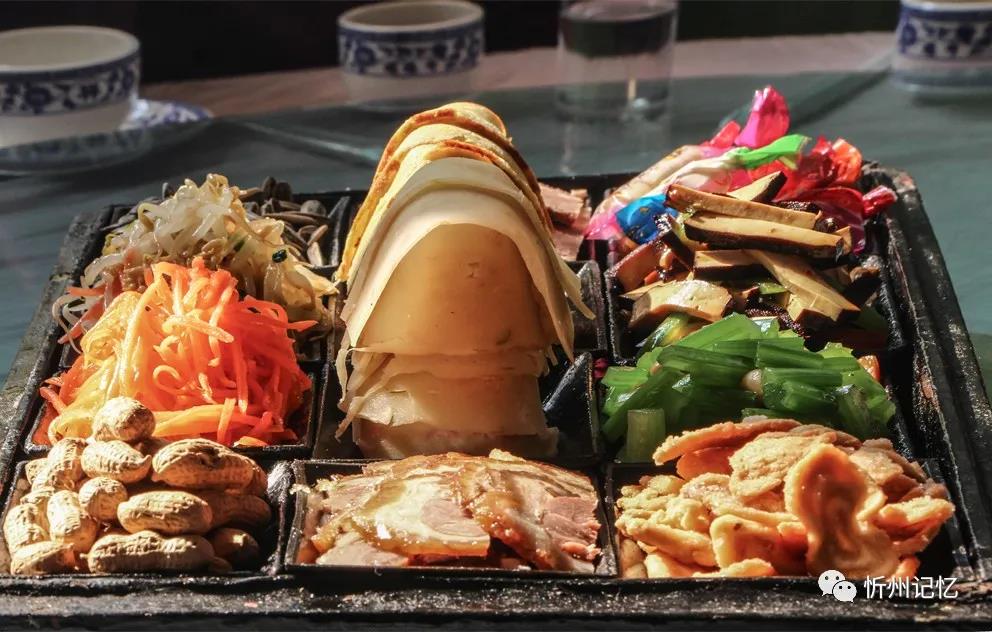 水菜盒子,是一個(gè)木制的長方形盒子,長約40多厘米,寬約20多厘米,高約10多厘米。木盒分蓋子和底座,底色多漆為紅黑兩色。蓋子上有的還畫有人物、山水、花卉等圖案,為描金漆處理。底座內(nèi)有12個(gè)木制的小長方形碟子,以3行4列的形式排列,用來裝涼拌菜。傳統(tǒng)的涼拌菜為四葷、二素、六干果,但后來大多演變?yōu)樗娜?、四素、四干果。其中的“四葷”為雞蛋餅、冷片肉、蒸肉、鹵肉;“四素”幾乎全是清淡的蔬菜,如綠豆芽、胡蘿卜、土豆絲、菠菜、胡芹等;“六干果”分別是葵花子、水果糖、南瓜子、油蛋蛋、金銀棗、蝦片。在忻府區(qū),過去家家戶戶但凡婚喪嫁娶,總要上水菜盒子,這就是老忻州人好說的“八八六六”。其中“八八”即水菜盒子(除去里面的干果正好8小碟菜),代表涼菜。