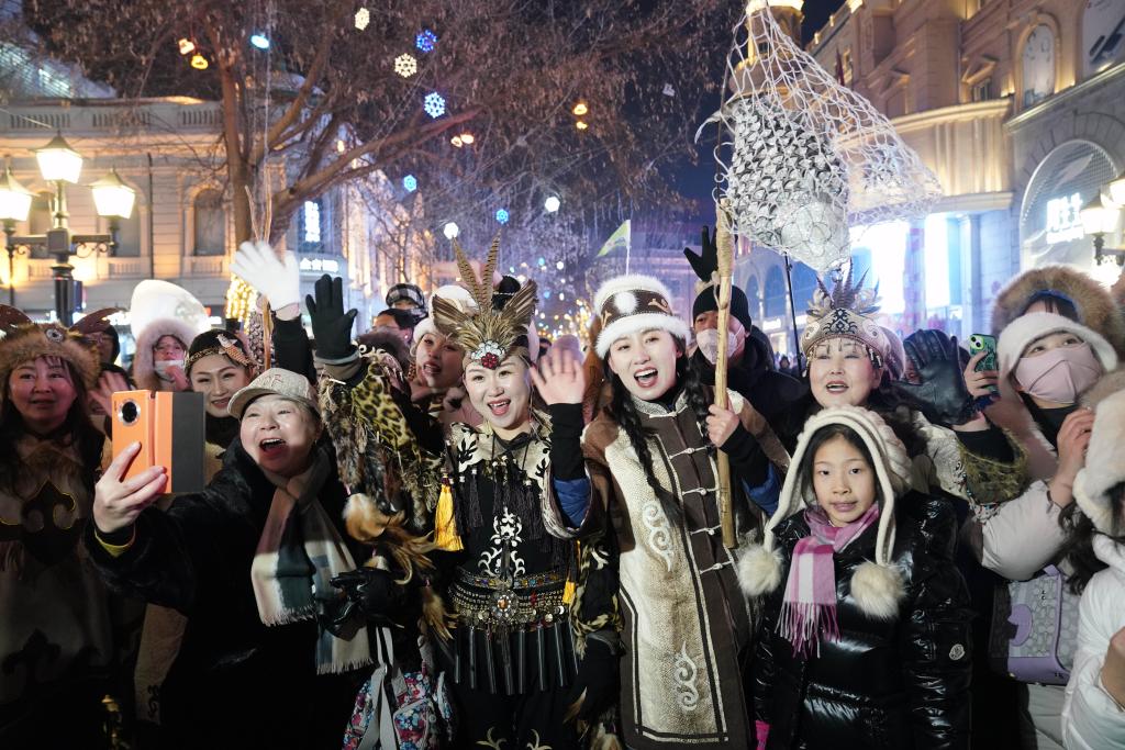 1月6日,身著赫哲族服飾的赫哲族群眾和饒河縣文旅推薦官在哈爾濱中央大街上與游客互動。新華社記者王建威攝