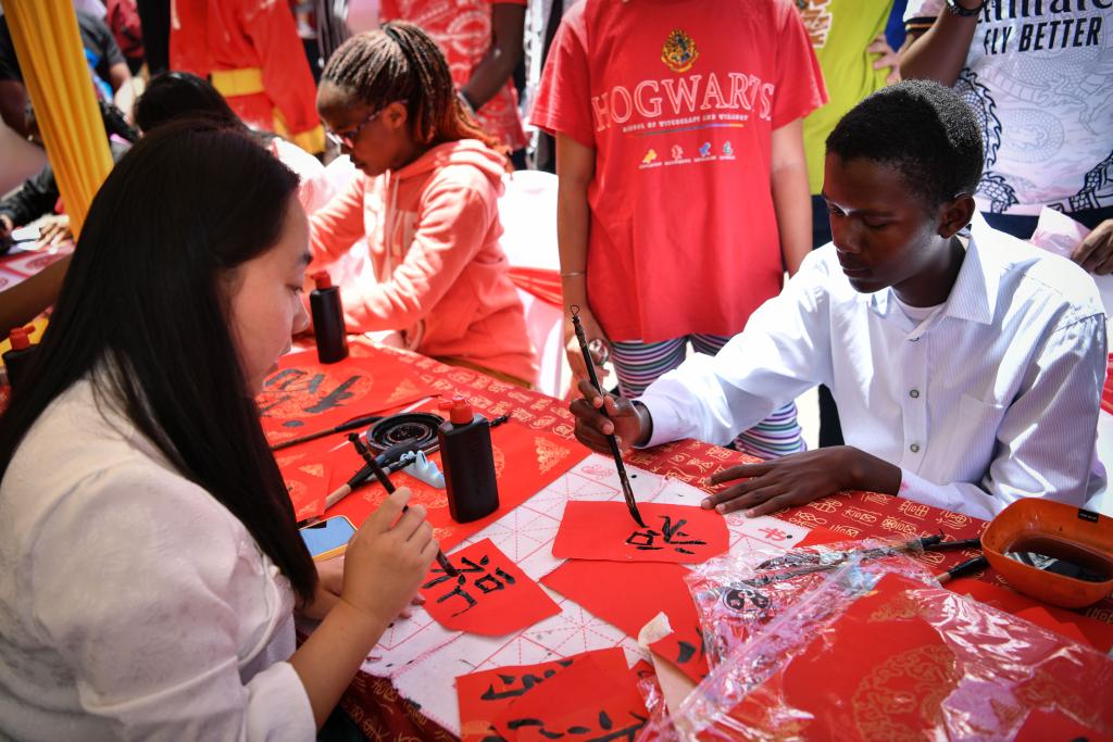 2月10日,在肯尼亞首都內(nèi)羅畢,人們?cè)趦?nèi)羅畢中國(guó)春節(jié)廟會(huì)上體驗(yàn)中國(guó)書(shū)法。(新華社記者韓旭 攝)