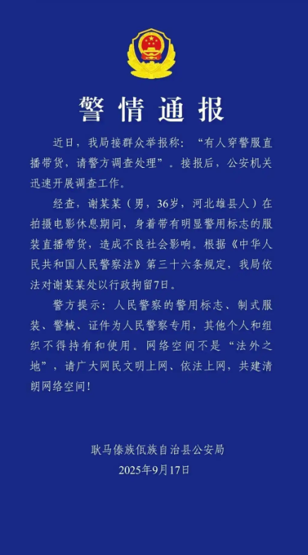 警服作為人民警察專用制服,是國家公權(quán)力和法治尊嚴(yán)的重要外在象征。根據(jù)《人民警察法》等法律法規(guī),人民警察的警用標(biāo)志、制式服裝、警械、證件為專用物品,其他任何個人和組織不得持有和使用。即便因影視創(chuàng)作確需使用,也須報省級公安機(jī)關(guān)批準(zhǔn),并嚴(yán)格限定于拍攝期間。謝孟偉方面所稱“劇組戲服”之說,實則試圖混淆拍攝用途與商業(yè)行為之間的明確界限。