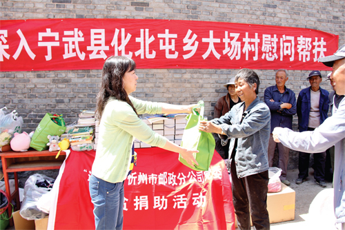 據悉,大場村距離寧武縣城約40 公里,由于地處山區(qū),經濟和交通狀況較差。自2009 年以來,市郵政分公司每年指派專人在該村定點幫扶,募集款物捐助困難群眾,受到了當地政府和群眾的一致好評。圖為捐贈現場。(魯明強 趙崇凱 攝影報道)