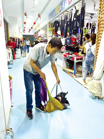 整個云河商場只有一層,共60多家商戶,衛(wèi)生清潔一天3次,工作量雖然不是很大,卻也不輕松。記者見到老馬時,他正在做商場關(guān)門前的最后一次清掃。不時有商戶喊老馬過去收紙箱和塑料袋,老馬加快了手里的動作?!吧虉鍪枪矆鏊?,管理也挺嚴格的,我得隨時注意看哪里有了垃圾,或是公共設(shè)施出了問題,要不人來人往怕出事。干凈整潔的環(huán)境代表著商場的形象,也能讓顧客購物時有個好心情,這也是我工作的價值吧?!崩像R坦言,有的人衛(wèi)生習慣特別不好。商場里童裝生意最為火爆,有個別帶孩子的家長直接讓孩子隨地大小便,不僅弄臟了環(huán)境也作了不良示范。老馬希望通過創(chuàng)衛(wèi),大家愛護環(huán)境衛(wèi)生的意識得到提高,這樣他也可以輕松點了。(王菲)