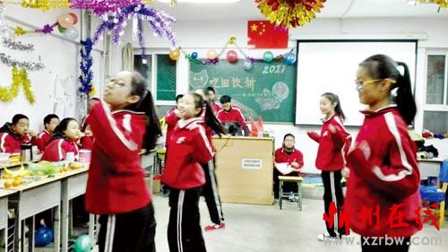 聯(lián)歡會由各班學(xué)生自己精心組織、排練,并由學(xué)生自主開展。同學(xué)們熱情高漲,積極參與,充分發(fā)揮自己的特長,表演自己最拿手的節(jié)目。每位同學(xué)都積極參與,每個人都成了“明星大腕”。班級聯(lián)歡會內(nèi)容豐富、精彩紛呈,舞蹈、歌曲、相聲、小品、游戲等節(jié)目一一亮相,喜慶祥和的氛圍濃厚強(qiáng)烈。圖為初二210班學(xué)生正在進(jìn)行節(jié)目表演。(郝江峰 攝)