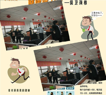 開門紅戰(zhàn)役打響,全員全身心投入,同時(shí)對(duì)職場內(nèi)員工的身體健康尤其是頸椎健康更是極大挑戰(zhàn)。中支綜管部門及時(shí)提醒辦公室內(nèi)的上班族,應(yīng)該保護(hù)頸椎健康,提示半小時(shí)后應(yīng)該起身活動(dòng)一下,用頭寫“米”字,并適時(shí)組織員工停下手中的工作,打開電視機(jī),集中做好工間勁椎操。保護(hù)頸椎,保護(hù)自己,服務(wù)公司,以充沛的體能服務(wù)開門紅戰(zhàn)役。