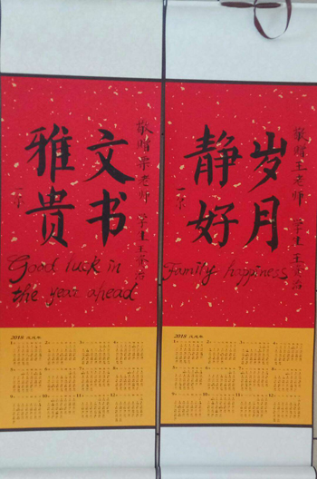 我市新觀念作家,雙語書法家,英語詞匯學(xué)者特意給毛里求斯姑娘送上新年的大祝福年歷。兩幅手寫的大楷福字下面是毛筆英文good luck in the year ahead.live long and prosper.
