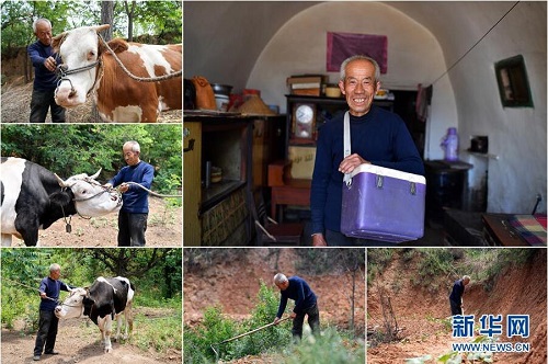 曹晉忠,男,1949年出生,山西省長治市武鄉(xiāng)縣鋪上村人。曹晉忠是村里的動物防疫員,自己種了4畝玉米、2畝小米。因為妻子常年臥病在床,曹晉忠一家是該村的精準扶貧對象。曹晉忠說,醫(yī)護人員經(jīng)常上門進行健康狀況隨訪,駐村工作隊也常來家里幫忙,現(xiàn)在看病不發(fā)愁,干活有人幫,生活挺好的。 右上:曹晉忠肖像;左上、左中、左下:曹晉忠在給村里的牛做檢查;下中、下右:曹晉忠在地里干農(nóng)活(拼版照片,6月12日攝)。 地處晉東南的山西省長治市,位于由太行山、太岳山環(huán)繞而成的上黨盆地中。在群山中、崖壁上,許多村莊自然條件惡劣,基礎設施落后,脫貧致富是大山深處人們的迫切心愿。 近年來,一場場脫貧攻堅戰(zhàn),在一個個深山村打響。政府全力探索脫貧路徑的同時,山區(qū)百姓因地制宜,靠自己的雙手和智慧走上致富路,交出了一份扎實的脫貧答卷。 記者在太行山、太岳山一路尋訪,記錄下多位70歲老人的生活。這些共和國的同齡人,親歷了山鄉(xiāng)的巨變,見證著長治山區(qū)脫貧攻堅偉大工程的一步步推進。 新華社記者 詹彥 攝