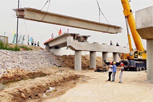 據(jù)了解,牧馬河大橋自開工以來,承擔大橋施工任務的太原市政總公司的建設者們?yōu)楸4髽蚰馨磿r、按質、按量建成而日夜奮戰(zhàn),每天投入100多個工人,分“ 三班”倒施工。據(jù)介紹,目前,大橋進入橋面鋪設階段,工人們每天幾乎進行的是水、陸、空立體施工。從25日一早開始,1臺大型拖車將1公里外預制的箱梁運來,1臺大型吊車每天張開巨大吊臂在高空輸送箱梁,每個箱梁長為20米、重約60噸,整個橋面共由70塊箱梁組成。據(jù)現(xiàn)場施工技術人員介紹,過去的牧馬河橋長130米,寬僅有8.5米,嚴重制約著南北向車輛通行。新建的大橋長為140米,7跨30米寬,設計為雙向四車道。
