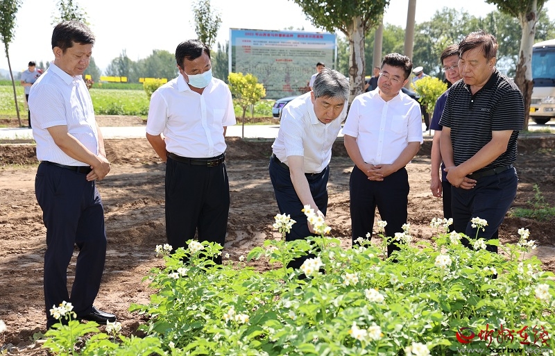 五寨是傳統(tǒng)農(nóng)業(yè)大縣,馬鈴薯種植歷史悠久。如今在小胡會村的馬鈴薯新品種、新技術(shù)示范基地,綠油油的馬鈴薯,白色小花競相開放,抬頭遠眺,跨過大型移動噴灌設(shè)備,馬鈴薯苗一眼望不到邊?;赝ㄟ^馬鈴薯新品種、新技術(shù)的示范,篩選出品質(zhì)優(yōu)、抗病性強、產(chǎn)量高、適宜本土種植的馬鈴薯新品種(系),推動馬鈴薯先進適用栽培新技術(shù)的推廣應(yīng)用。朱曉東走進田壟,察看薯苗長勢,與農(nóng)技專業(yè)人員交流,了解減化肥減農(nóng)藥試驗情況,詢問菜用型馬鈴薯與加工型馬鈴薯的價值區(qū)別。他強調(diào),要切實把五寨80里丁字平川耕地資源用足用好,深研細究新品種新技術(shù),不僅要在馬鈴薯的塊莖上做文章,在莖、葉、花上都要深入研究,調(diào)動專業(yè)機構(gòu)專業(yè)人員在馬鈴薯花入茶、提取香精等更多方面努力探索,切實放大規(guī)模產(chǎn)業(yè)的獨特優(yōu)勢。