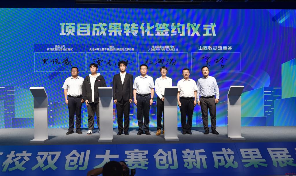 項(xiàng)目成果轉(zhuǎn)化簽約儀式現(xiàn)場。馮曉磊 攝 9月16日,首屆數(shù)字經(jīng)濟(jì)高校雙創(chuàng)大賽創(chuàng)新成果展示暨頒獎典禮在忻州舉辦。省委書記藍(lán)佛安致賀信,教育部副部長、黨組成員孫堯發(fā)表視頻致辭,省委常委、統(tǒng)戰(zhàn)部部長徐廣國出席活動。省委統(tǒng)戰(zhàn)部副部長、省工商聯(lián)黨組書記陳旭忠,省教育廳黨組書記、廳長馬駿,省工商聯(lián)主席景普秋,省科協(xié)黨組書記、副主席丁紀(jì)崗,市委書記朱曉東,市委副書記、市長李建國,省委統(tǒng)戰(zhàn)部副部長郭延斌,省工信廳副廳長尚阿浪,團(tuán)省委副書記陳鍇,省工商聯(lián)副主席李劍英,副市長、太忻經(jīng)濟(jì)一體化發(fā)展忻州區(qū)運(yùn)營中心黨委書記、主任王建峰出席活動。 藍(lán)佛安在賀信中指出,當(dāng)今時(shí)代,數(shù)字浪潮正以迅速崛起、深度滲透的姿態(tài)席卷而來,成為影響全球格局、重塑競爭秩序、加速時(shí)代變革的重要力量。近年來,山西深入學(xué)習(xí)貫徹習(xí)近平總書記關(guān)于發(fā)展數(shù)字經(jīng)濟(jì)的重要論述,認(rèn)真貫徹落實(shí)黨的二十大關(guān)于“加快建設(shè)網(wǎng)絡(luò)強(qiáng)國、數(shù)字中國”的重大部署,大力推動產(chǎn)業(yè)數(shù)字化和數(shù)字產(chǎn)業(yè)化,全省數(shù)字經(jīng)濟(jì)跑出加速度、邁上新臺階。省委十二屆六次全會明確將推動數(shù)字經(jīng)濟(jì)發(fā)展壯大作為六大轉(zhuǎn)型行動之一,必將為山西進(jìn)一步加快轉(zhuǎn)型發(fā)展、奮進(jìn)“兩個基本實(shí)現(xiàn)”目標(biāo)注入強(qiáng)勁動能。 藍(lán)佛安強(qiáng)調(diào),數(shù)字經(jīng)濟(jì)高質(zhì)量發(fā)展,關(guān)鍵在創(chuàng)新,根本靠人才。數(shù)字經(jīng)濟(jì)高校雙創(chuàng)大賽為大學(xué)生青年才俊擁抱數(shù)字浪潮、投身創(chuàng)業(yè)創(chuàng)新提供了新的平臺,在高校、企業(yè)、資本和創(chuàng)新項(xiàng)目之間搭建了新的橋梁。希望同學(xué)們打牢知識基礎(chǔ)、勇攀科技高峰,以昂揚(yáng)向上的朝氣、敢為人先的銳氣,在探索美好未來、逐夢數(shù)字時(shí)代的征途上大展身手,努力為實(shí)現(xiàn)中華民族偉大復(fù)興的中國夢貢獻(xiàn)智慧和力量。同時(shí),也希望參與和支持本次大賽的省內(nèi)外各高校、企業(yè)和機(jī)構(gòu),攜起手來,加強(qiáng)合作,共創(chuàng)數(shù)字山西美好未來,助力數(shù)字中國建設(shè)。 孫堯在致辭中強(qiáng)調(diào),黨的二十大報(bào)告中指出“教育、科技、人才是全面建設(shè)社會主義現(xiàn)代化國家的基礎(chǔ)性、戰(zhàn)略性支撐”,山西省教育廳和省工商聯(lián)主辦的這場數(shù)字經(jīng)濟(jì)高校雙創(chuàng)大賽,是培養(yǎng)數(shù)字經(jīng)濟(jì)創(chuàng)新創(chuàng)業(yè)人才的有效途徑,也是推動數(shù)字經(jīng)濟(jì)產(chǎn)教融合創(chuàng)新發(fā)展的重要平臺,對促進(jìn)高校學(xué)生創(chuàng)新創(chuàng)業(yè)、推動項(xiàng)目落地見效具有積極作用。希望這些年輕的創(chuàng)業(yè)者繼續(xù)保持創(chuàng)新的激情,成為民營經(jīng)濟(jì)數(shù)字化轉(zhuǎn)型的中堅(jiān)力量。希望大賽持續(xù)舉辦,將其打造為我國數(shù)字經(jīng)濟(jì)領(lǐng)域的一個重要平臺,營造鼓勵創(chuàng)新創(chuàng)業(yè)創(chuàng)造的社會氛圍,推動數(shù)字經(jīng)濟(jì)的蓬勃發(fā)展。 據(jù)介紹,這是全國首個圍繞數(shù)字經(jīng)濟(jì)領(lǐng)域,面向高校學(xué)子的雙創(chuàng)大賽。大賽以“輕輕聯(lián)動·數(shù)實(shí)融合”為主題,旨在為高校、政府、企業(yè)、資本和創(chuàng)新項(xiàng)目之間建立起溝通橋梁,推動數(shù)字經(jīng)濟(jì)領(lǐng)域人才培養(yǎng),助力山西數(shù)字經(jīng)濟(jì)高質(zhì)量發(fā)展。大賽圍繞產(chǎn)業(yè)數(shù)字化、數(shù)字產(chǎn)業(yè)化設(shè)置創(chuàng)新創(chuàng)業(yè)和新媒體雙賽道,通過打造高水平的創(chuàng)新創(chuàng)業(yè)平臺,積極引導(dǎo)高校畢業(yè)生留創(chuàng)本地,助力年輕人實(shí)現(xiàn)創(chuàng)新創(chuàng)業(yè)夢想,共同為山西數(shù)字經(jīng)濟(jì)高質(zhì)量發(fā)展“添磚加瓦”。 大賽自6月5日正式啟動以來,獲得全國60多所高校、近百家數(shù)字經(jīng)濟(jì)企業(yè)的積極響應(yīng),大賽抖音話題#這YOUNG很山西#累計(jì)播放量已突破1.1億次,線上線下累計(jì)參賽人數(shù)超10萬人。創(chuàng)新創(chuàng)業(yè)賽道報(bào)名項(xiàng)目525組,項(xiàng)目領(lǐng)域涵蓋數(shù)字文娛、數(shù)字能源、數(shù)字農(nóng)業(yè)、數(shù)字智造、數(shù)字醫(yī)療、數(shù)字教育、數(shù)字生活、數(shù)字基建等多個方面,最終甄選出12組數(shù)字經(jīng)濟(jì)領(lǐng)域具有引領(lǐng)性和廣闊發(fā)展前景的科技創(chuàng)新成果,培育出一批實(shí)用型數(shù)字經(jīng)濟(jì)人才。新媒體賽道入圍優(yōu)秀作品突破3000個,創(chuàng)作內(nèi)容主要圍繞山西的厚重歷史、自然風(fēng)光、文明古跡、特色美食、人文情懷、數(shù)字經(jīng)濟(jì)發(fā)展等多個角度,最終評選出20個獲獎視頻和12名周冠軍、32名優(yōu)秀創(chuàng)作者,把短視頻打造成為展示山西文化底蘊(yùn)、開放形象和經(jīng)濟(j