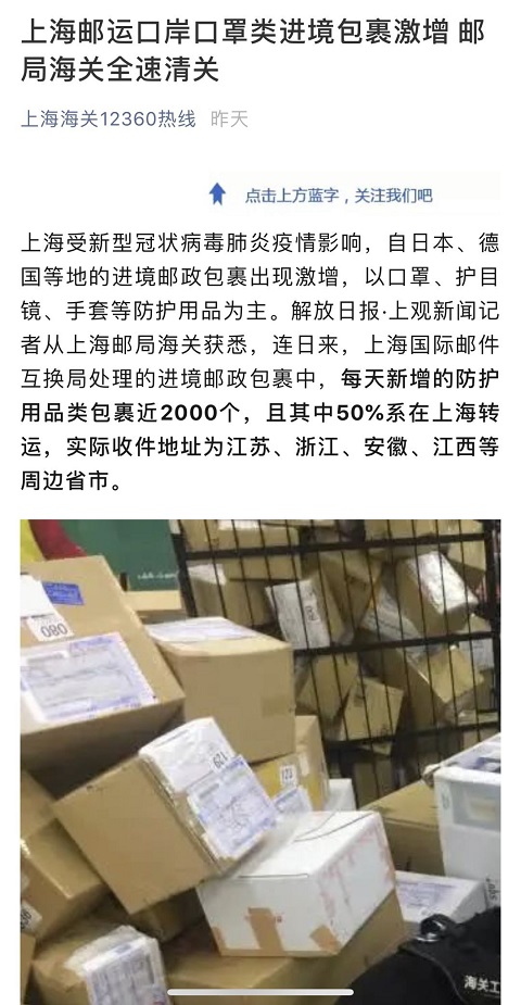 (上海郵運(yùn)口岸口罩類進(jìn)境包裹激增 郵局海關(guān)全速清關(guān))