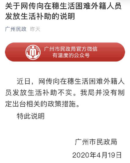 真相:廣州市民政局19日發(fā)表說(shuō)明:近日,網(wǎng)傳向在穗生活困難外籍人員發(fā)放生活補(bǔ)助不實(shí)。我局并沒(méi)有制定出臺(tái)相關(guān)的政策措施。