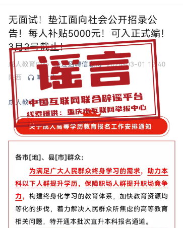 真相:近日,“墊江招聘信息網(wǎng)”微信公眾號(hào)發(fā)布信息:“無面試!重慶墊江面向社會(huì)公開招錄公告!每人補(bǔ)貼5000元!可入正式編!”部分網(wǎng)民看到該信息后誤認(rèn)為,墊江面向社會(huì)以補(bǔ)貼形式招錄具有正式編制的公務(wù)人員,于是紛紛向墊江縣有關(guān)部門致電咨詢招錄情況。經(jīng)核實(shí),近年來,墊江未曾以補(bǔ)貼方式和不經(jīng)過面試招錄具有正式編制公務(wù)人員。該信息實(shí)則為成人學(xué)歷提升培訓(xùn)信息,而非正式編制公務(wù)人員招錄信息。墊江縣互聯(lián)網(wǎng)信息辦公室已依法對(duì)發(fā)布該信息的微信公眾號(hào)負(fù)責(zé)人進(jìn)行約談和教育批評(píng),指出虛假信息的危害性,并責(zé)令刪除相關(guān)信息。(來源:重慶辟謠)