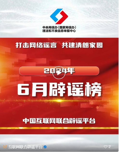 | 打擊網(wǎng)絡(luò)謠言 共建清朗家園 中國(guó)互聯(lián)網(wǎng)聯(lián)合辟謠平臺(tái)2024年6月辟謠榜 |