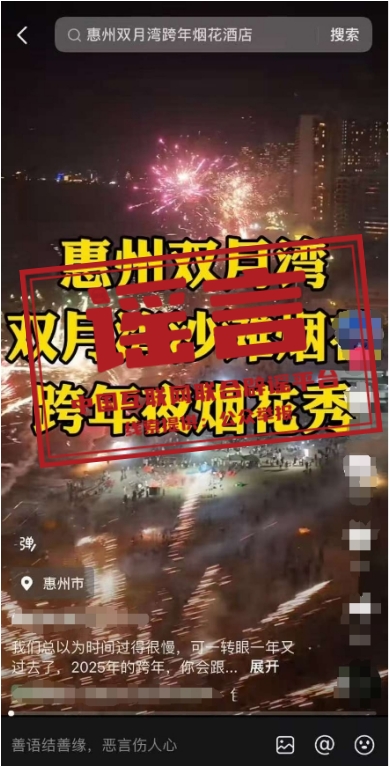 真相:近期,網(wǎng)絡(luò)上出現(xiàn) “廣東惠州雙月灣2025跨年煙花秀”“2025雙月灣跨年倒數(shù)夜”“雙月灣跨年煙花秀”等信息,引發(fā)關(guān)注。經(jīng)相關(guān)部門核實(shí),網(wǎng)傳信息均系不實(shí)信息。目前廣東省惠州市惠東縣雙月灣沒有舉辦2025年跨年煙花秀活動的安排,請廣大游客不聽謠、不信謠、不傳謠,一切以官方發(fā)布信息為準(zhǔn)。(來源:“惠州日報(bào)”微信公眾號、惠東文旅體)