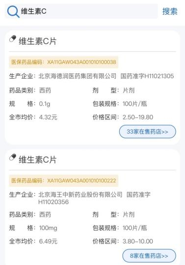 第四步:以搜索維生素C為例,可以看到下方展示了在售的相關(guān)商品及價(jià)格等信息。
