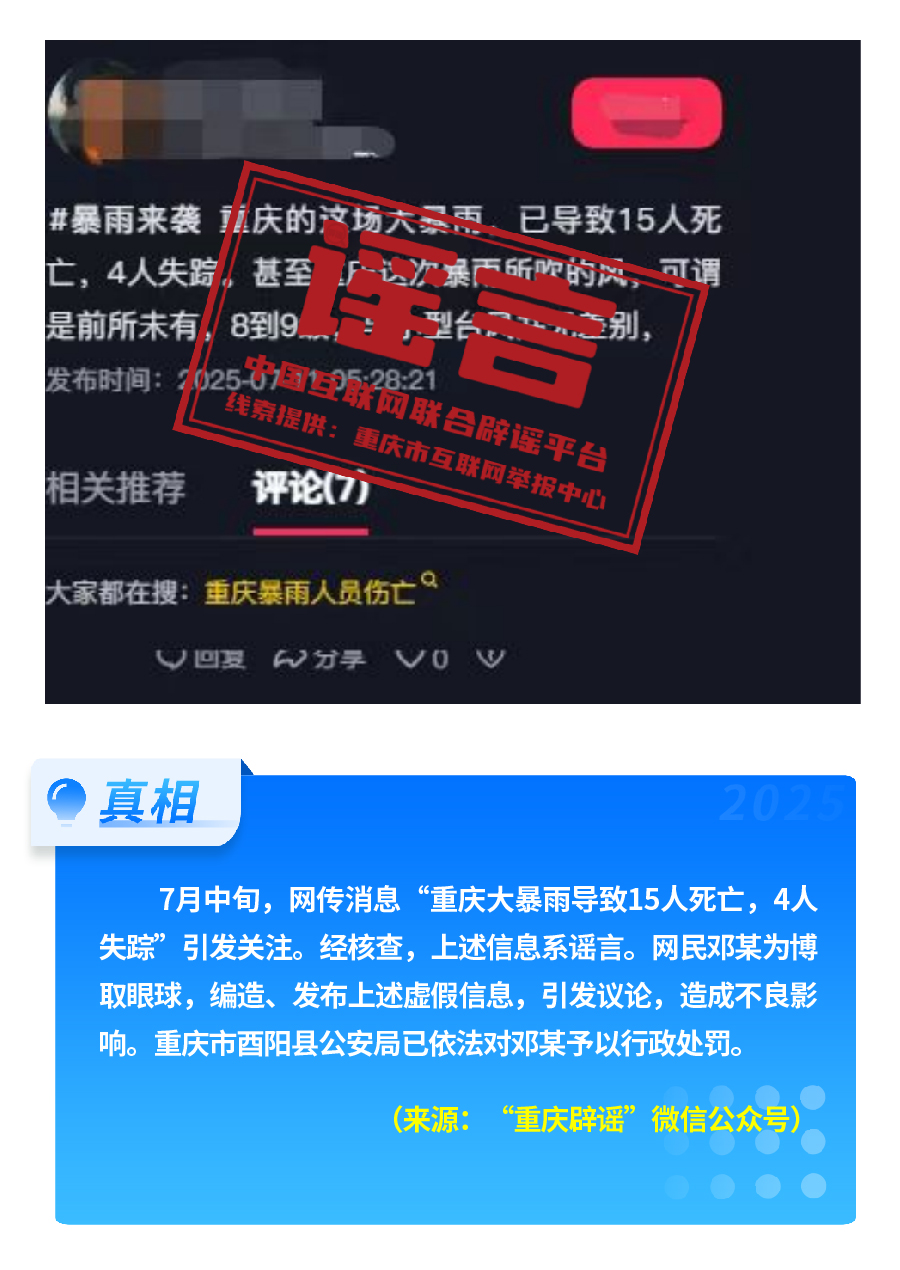 近期,網(wǎng)上接連出現(xiàn)發(fā)布虛假“警情通報”的惡性造謠傳謠案件,炮制傳播“昆明駕車撞人案131人死亡”“杭州自來水接入糞水”及涉釋永信虛假“警情通報”,模仿“藍底白字”格式,杜撰聳人聽聞細節(jié),損害政府公信力,嚴重擾亂社會秩序?!霸菏款A測廣東將發(fā)生8級以上大地震”公然偽造專家聊天截圖,謊報地震預警。還有造謠者借盛夏高溫酷暑與洪澇災害,編造“安徽淮北、山東泰安等地多人因高溫死亡” “重慶大暴雨導致15人死亡、4人失蹤”等謠言,蹭炒熱點、煽動情緒。