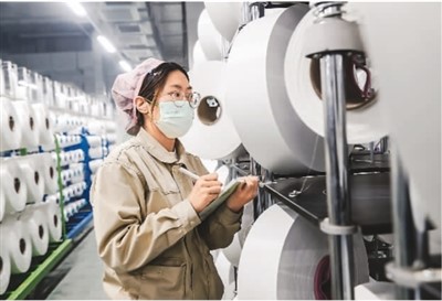 江蘇省宿遷市泗陽(yáng)縣近年來(lái)加快推動(dòng)紡織企業(yè)生產(chǎn)數(shù)字化轉(zhuǎn)型,實(shí)現(xiàn)高質(zhì)量發(fā)展。圖為江蘇芮邦科技有限公司生產(chǎn)車(chē)間內(nèi),工人在智能化生產(chǎn)線(xiàn)上作業(yè)。裴 成攝(人民視覺(jué))
