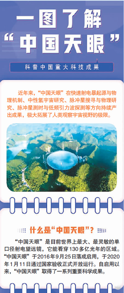 “中國(guó)天眼”全稱是500米口徑球面射電望遠(yuǎn)鏡,簡(jiǎn)稱FAST。FAST采用全新的設(shè)計(jì)理念,是當(dāng)今世界最大的、最靈敏的單口徑球面射電望遠(yuǎn)鏡,能夠在無(wú)線電波段搜索來(lái)自百億光年之外的微弱信號(hào)。