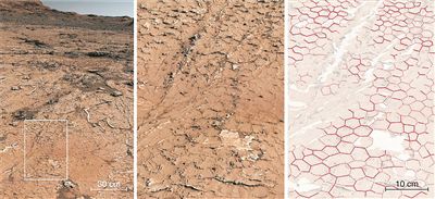 “好奇”號在穿越火星蓋爾隕石坑的第3154天分析了沉積巖中的六角形化石圖案。圖片來源:《自然》雜志