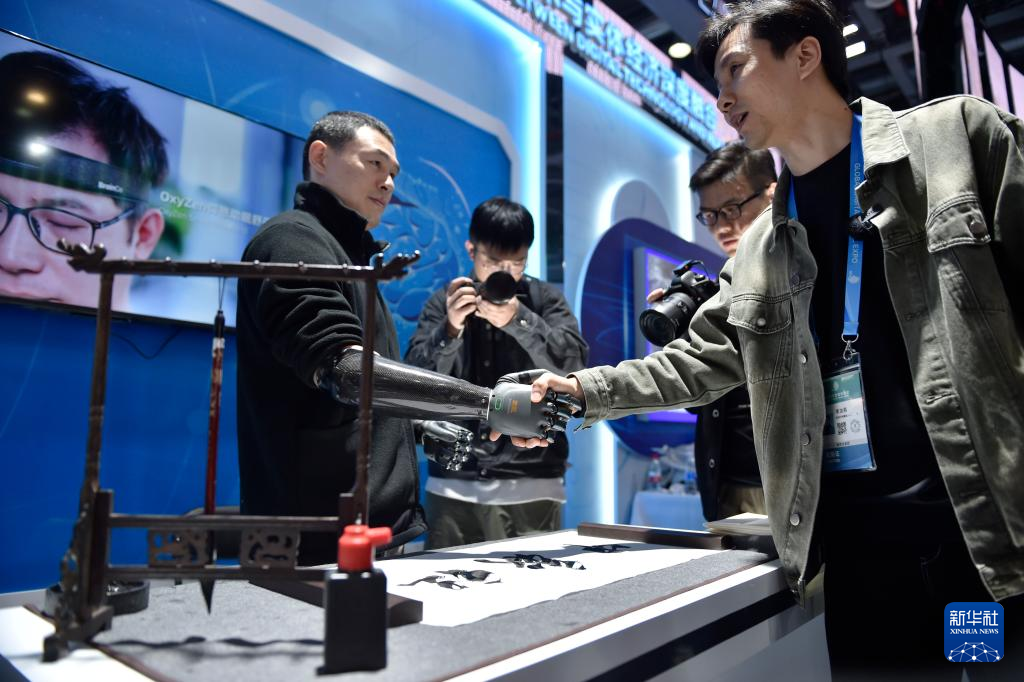 11月23日,在第二屆全球數(shù)字貿(mào)易博覽會上,觀眾在前沿趨勢館體驗與穿戴智能仿生手的參展人員握手。新華社記者劉嶺逸攝