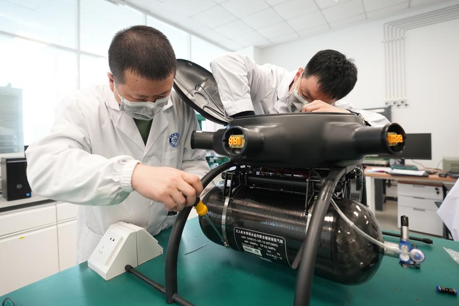 3月28日,科研人員在為無人機裝配高比能氫混動力電源。新華社記者 潘昱龍 攝