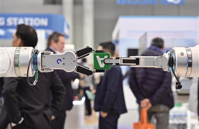 在近日舉行的2024年德國漢諾威工業(yè)博覽會上,人工智能成為重點(diǎn)關(guān)注的領(lǐng)域之一。圖為會上一款機(jī)器人在演示傳遞物品。新華社記者 任鵬飛 攝