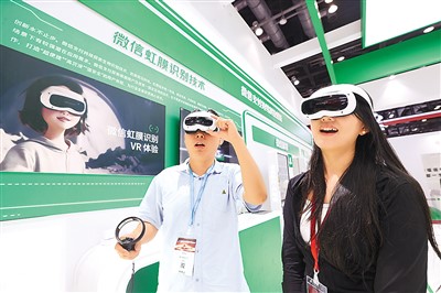 隨著數(shù)字金融領(lǐng)域創(chuàng)新成果不斷投入應用,刷掌支付、虹膜識別支付等支付手段逐步走進居民生活。圖為觀眾在2024中國國際金融展上通過虛擬現(xiàn)實設備體驗微信虹膜識別技術(shù)。陳曉根攝(人民視覺)