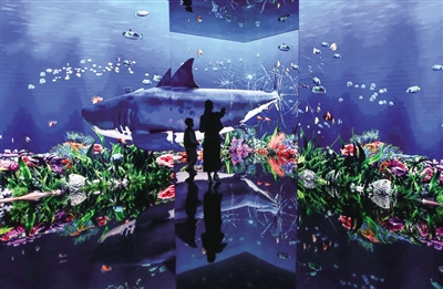 圖為游客在位于濟南市的山東省美術(shù)館參觀體驗“無限之?!背两紸I數(shù)字藝術(shù)展。新華社發(fā)(郝鑫城 攝)
