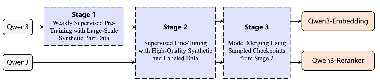 向量模型像是AI的“翻譯器”,它可以將文本、圖片等人類可認知的非結(jié)構(gòu)化信息,映射到機器更易理解的向量空間,再基于這些向量實現(xiàn)高效的信息分類、檢索或排序。也正因此,向量模型對于提升AI的語義理解、信息檢索、多模態(tài)融合等核心能力至關重要?;谇?模型,通義團隊通過對比訓練、SFT、模型融合等方法,打造出全新的千問3向量模型,包含文本嵌入模型 Qwen3-Embedding以及文本排序模型Qwen3-Reranker。