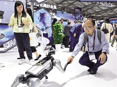 6月18日,觀眾在2025年世界移動通信大會(上海)中國電信展臺與智能機(jī)器狗互動。 記者 陳愛平 攝