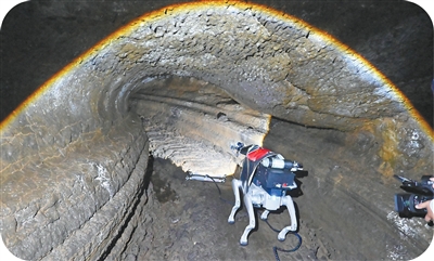 圖為柔性臂機(jī)器人在鏡泊湖火山地下熔巖管道現(xiàn)場(chǎng)工作。張春祥攝(人民視覺(jué))