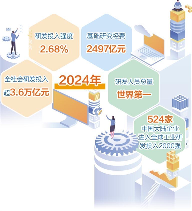 科技投入持續(xù)增加。2024年全社會研發(fā)投入超3.6萬億元,較2020年增長48%;研發(fā)投入強度達(dá)2.68%,超過歐盟國家平均水平;研發(fā)人員總量世界第一?;A(chǔ)研究經(jīng)費達(dá)2497億元,較2020年增長超過70%,在量子科技、生命科學(xué)、物質(zhì)科學(xué)、空間科學(xué)等領(lǐng)域取得一批重大原創(chuàng)性成果,高水平國際期刊論文數(shù)量和國際專利申請量連續(xù)5年世界第一。