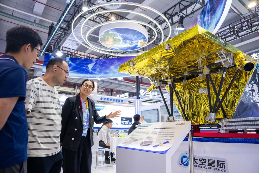 9月24日,第四屆北斗規(guī)模應(yīng)用國際峰會(huì)在湖南株洲開幕。圖為在株洲國際會(huì)展中心,工作人員(左三)在介紹一臺(tái)對地觀測衛(wèi)星。新華社記者 陳思汗 攝
