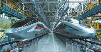 圖為兩列CR450動(dòng)車組樣車??吭诤币瞬齽?dòng)車所。唐 瑩攝(人民視覺(jué))