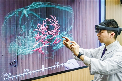 圖為科研人員展示通過(guò)混合現(xiàn)實(shí)技術(shù),微米級(jí)呈現(xiàn)腦機(jī)接口裝置與大鼠大腦主要血管和腦組織的空間位置關(guān)系。新華社記者 肖藝九 攝