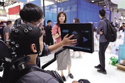 圖為2024服貿(mào)會上,工作人員在為參觀者講解使用非侵入式腦機(jī)接口技術(shù)的腦控神經(jīng)康復(fù)訓(xùn)練機(jī)器人。記者 戚曉毅 攝