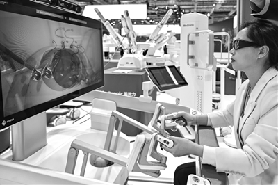 參會者在第七屆進博會醫(yī)療器械及醫(yī)藥保健展區(qū)體驗操作一款外科手術機器人。(資料照片)