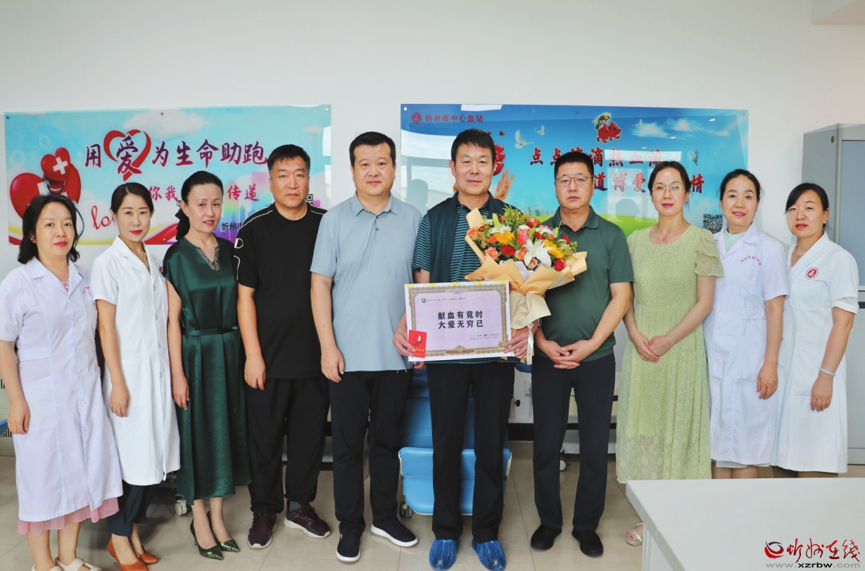 梁占海先生是我市繁峙籍人士,原計(jì)劃在7月18日,60周歲生日當(dāng)天完成最后一次獻(xiàn)血。連日暑浪滾滾,7月13日下午他瞅準(zhǔn)雨后氣溫下降的空隙,駕車(chē)125公里來(lái)到市中心血站,捐獻(xiàn)2治療量的血小板,在六十周歲生日,完成最后一獻(xiàn)“光榮退役”。血站郭建卿站長(zhǎng)率班子成員到現(xiàn)場(chǎng)慰問(wèn),對(duì)他發(fā)揚(yáng)人道主義精神,弘揚(yáng)助人為樂(lè)品德的行動(dòng)表示贊揚(yáng),對(duì)他為我市無(wú)償獻(xiàn)血事業(yè)做出的貢獻(xiàn)表示感謝。獻(xiàn)血結(jié)束后,中心血站的領(lǐng)導(dǎo)護(hù)士同梁占海先生合影留念,祝賀他花甲生日吉祥、身體健康。