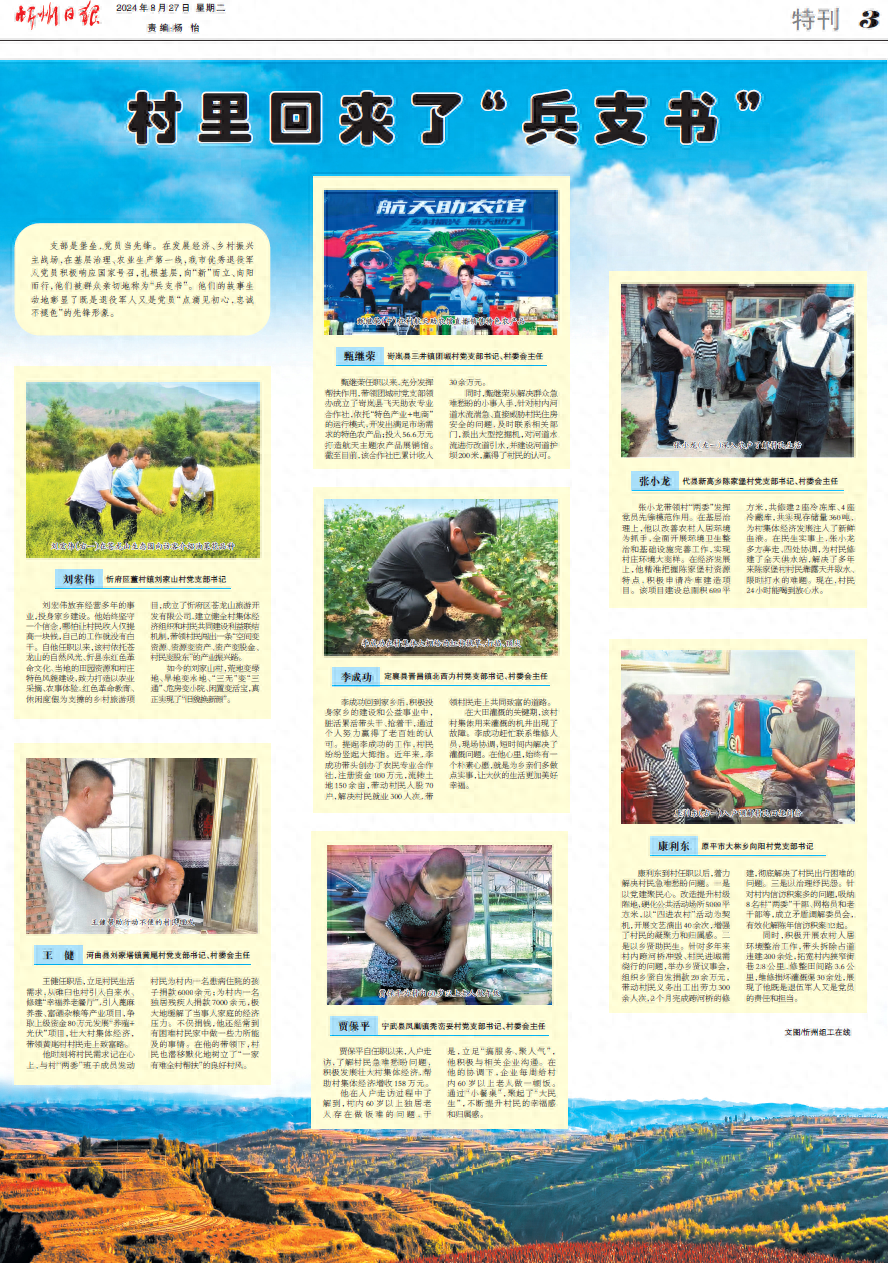 支部是堡壘,黨員當先鋒。在發(fā)展經(jīng)濟、鄉(xiāng)村振興主戰(zhàn)場,在基層治理、農(nóng)業(yè)生產(chǎn)第一線,我市優(yōu)秀退役軍人黨員積極響應國家號召,扎根基層,向“新”而立、向陽而行,他們被群眾親切地稱為“兵支書”。他們的故事生動地彰顯了既是退役軍人又是黨員“點滴見初心,忠誠不褪色”的先鋒形象。